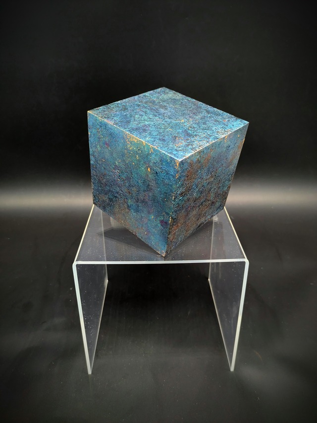 禅は宇宙。 アーティストZEN-SO KENJO がこの立方体に禅宇宙を表現。 人工の塗料などは一切使わず、銀箔の硫化のみで全ての色彩を表現している。 硫化は分子原子レベルのもので決して人の手では制御できず、まさに自然が作り出す偶然の美。デジタルでは表すことはできない天と地のみぞ知る領域に美しさが宿る。 なぜ銀箔なのか?銀は不安定な物質で変化を起こしやすい。 私たちの心も常に揺れ動き、不安や葛藤を抱える時も多い。 しかし、良くも悪くも諸行無常です。常にこのままと言う事はありえません。 銀箔が硫黄という起縁(因)で美しい色(果)に変わるように、私たちの心もちょっとした起縁で不安や葛藤から解放されるのです。 また、仏教では四角形をバランスの取れた調和や安定の象徴とします。 このzen-cubeを身近に飾ることで生活や心に彩りが生まれますよう願います。 サイズ:10cm×10cm×10cm 画材:銀箔、コンクリート Zen is the universe. Artist ZEN-SO KENJO has expressed the Zen universe in this cube. No artificial paints or other materials are used; all colors are expressed solely through sulfurized silver leaf. Sulfuration occurs at a molecular-atom level and is completely uncontrollable by human hands, resulting in a truly accidental beauty created by nature. This beauty resides in a realm known only to heaven and earth, something that cannot be expressed digitally. Why silver leaf? Silver is an unstable substance and prone to change. Our minds are also constantly in flux, often filled with anxiety and conflict. However, for better or worse, all things are impermanent. Nothing can remain the same forever. Just as silver leaf transforms into beautiful colors (results) through the influence of sulfur (cause), our minds can also be freed from anxiety and conflict with the slightest opportunity. In Buddhism, the square is a symbol of balanced harmony and stability. We hope that displaying this zen-cube will add color to your life and your heart. Size: 10cm x 10cm x 10cm Art Materials: Silver leaf, concrete