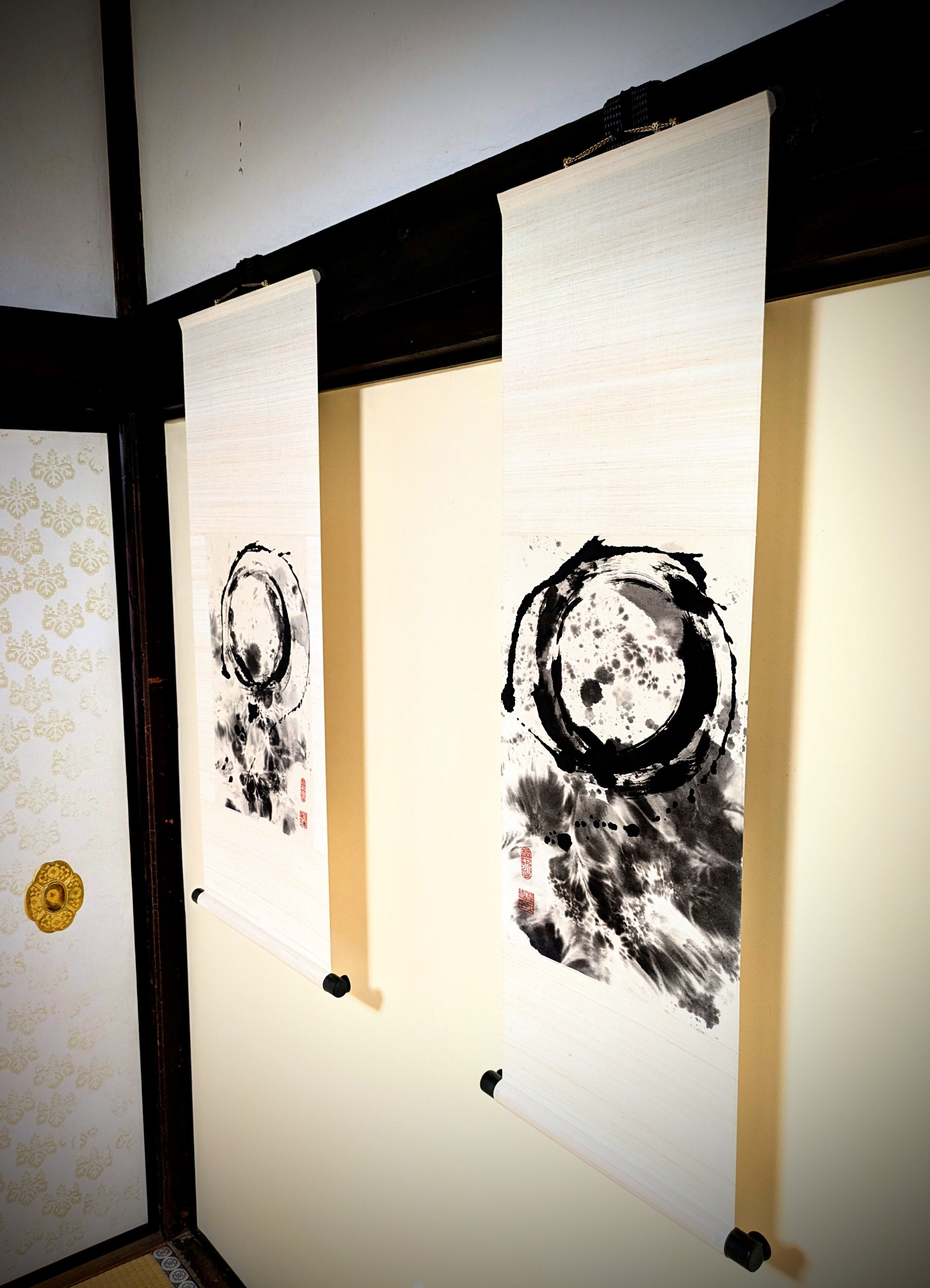 瞬間的な内なる平和を感じられるよう、墨の擦れや滲みをそのまま活かし描かれています。円相の形は禅の教えに根付いており、全ての物事が完璧なバランスと調和を持つという真理を伝えてくれます。