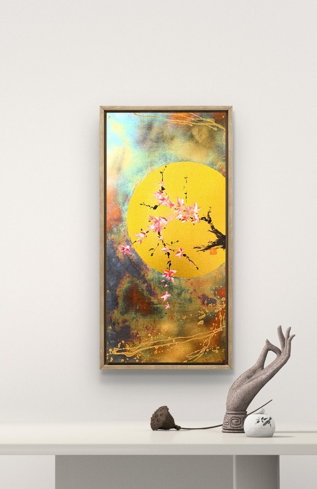 ■ すべての瞬間の美を感じる 「諸行無常 躑躅」は、移ろう時の流れを象徴する躑躅のアートです。この作品は、銀箔の硫化によって生まれる美しい自然の色彩をベースに繊細な筆致を用いることで、見る者に美しさと一瞬の大切さを伝えます。 流れるようなラインで描かれたこの躑躅は、存在感と儚さを際立たせ、見る者に尊い瞬間を思い起こさせます。躑躅の花は、生命の移ろいと、それに伴う感謝の気持ちを象徴し、私たちが日々の中で感じる真理を体現しています。 この作品を目にするたびに、あなたの心に新たな気づきが訪れ、日常生活に豊かな情感をプラスしてくれることでしょう。時の流れの中にある美しさを感じることで、心に深い感動が広がります。 サイズ:90cm×45cm 画材:金紙、銀箔、墨、岩絵具 Embrace the beauty of all moments. The "The impermanence of all things - Azalea" is an artwork symbolizing the fluidity of time through the vibrant azalea. This piece, utilizing vivid colors and delicate brushwork, conveys a message of beauty and the significance of each fleeting moment to the viewer. Rendered with flowing lines, this azalea stands out, emphasizing presence and transience, reminding the observer of the preciousness of moments. The azalea flower symbolizes the transience of life and the gratitude that accompanies it, embodying the truths we encounter in our daily lives. Each time you behold this piece, new realizations will wash over your heart, adding rich emotion to your everyday existence. By embracing the beauty inherent in the flow of time, a deep sense of inspiration will unfold within you. Size: 90cm×45cm Materials: gold paper, silver leaf, ink, rock paint