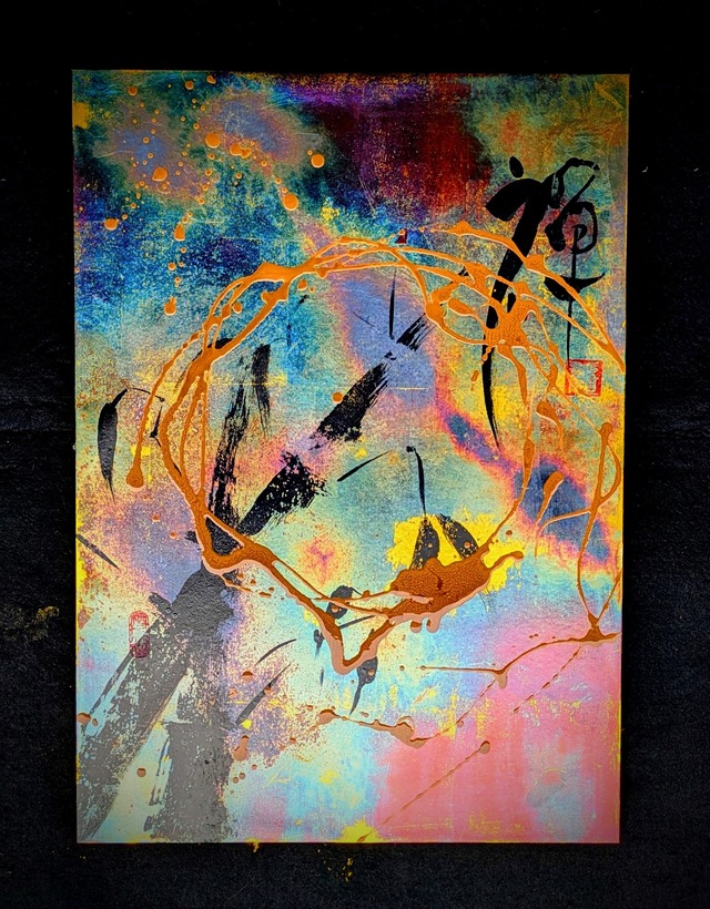 ■ 究極の精神に触れる 「円相-系列八十」は、シンプルでありながら深い意味を持つ円のアートです。この作品は、柔らかな曲線と鮮烈な色合いを用いることで、見る者に心の平穏と感謝の気持ちを伝えます。 流れるようなラインで構成されたこの円相は、存在感と静寂さを際立たせ、見る者に内なる平和を思い起こさせます。円の形は、調和やつながりを象徴し、私たちが共に歩む世界の真理を体現しています。 この作品を目にするたびに、あなたの心に安らぎが訪れ、日常生活に豊かなひらめきと安定感をプラスしてくれることでしょう。円相の持つ静かなエネルギーを感じることで、心に深い安寧が広がります。 サイズ:51.7cm×27cm 画材:和紙、墨、岩絵具、金粉 Embrace the ultimate spirit within you. The "Enso - Series 80" is an artwork featuring a circle that is simple yet rich in meaning. This piece, utilizing gentle curves and vivid colors, conveys a message of inner peace and gratitude to the viewer. Composed of flowing lines, this enso stands out, highlighting presence and tranquility, reminding the observer of their inner peace. The circle symbolizes harmony and connection, embodying the truth of the shared world we navigate together. Each time you behold this piece, a sense of calm will wash over your heart, adding rich inspiration and stability to your daily life. By embracing the quiet energy of the enso, a deep sense of serenity will unfold within you. Size: 51.7cm×27cm Materials: Japanese paper, ink, rock paint,Gold powder